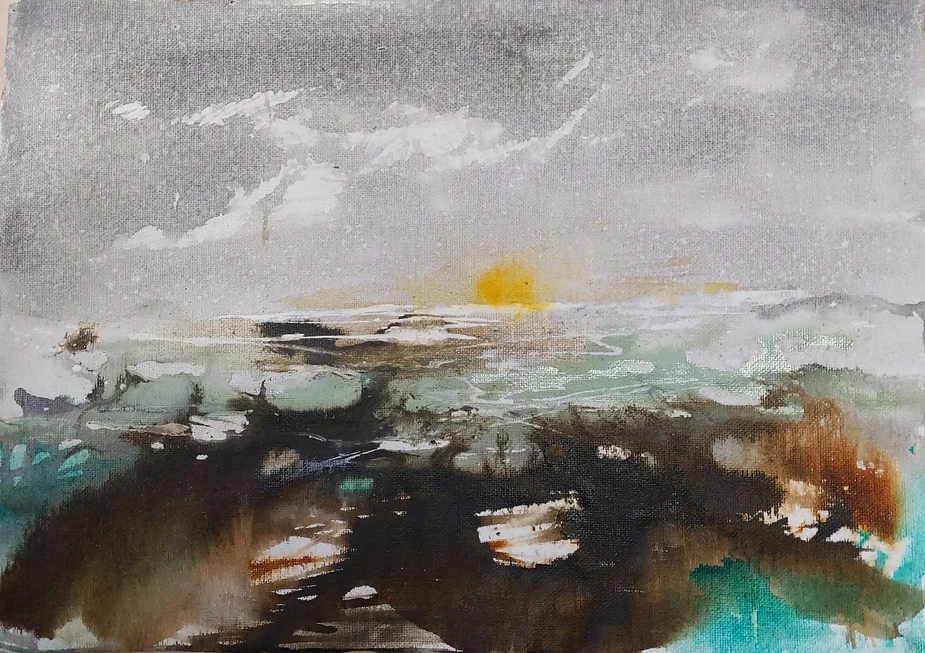 Acrylic, ink, metal leaf and resin on canvas bespoke black 4 cm frame.